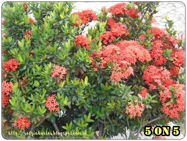 Estas também foram a Midian quem me falou o nome: Ixora é um género botânico pertencente à família Rubiaceae. É um arbusto muito apreciado nas regiões de clima quente. Seu aspecto é compacto e suas folhas têm uma textura de couro. A floração ocorre na primavera e verão, e apresenta inflorescências com numerosas flores de coloração amarela, vermelha, laranja ou cor-de-rosa. Pode ser cultivada isoladamente ou em maciços, sendo ótimas para esconder muros e muretas. Atrai polinizadores. Deve ser cultivada sempre a pleno sol, e não é muito exigente em fertilidade, sendo bastante rústica. Dispensa maiores manutenções, mas deve ser regada a intervalos regulares. Multiplica-se por estacas e não tolera geadas.